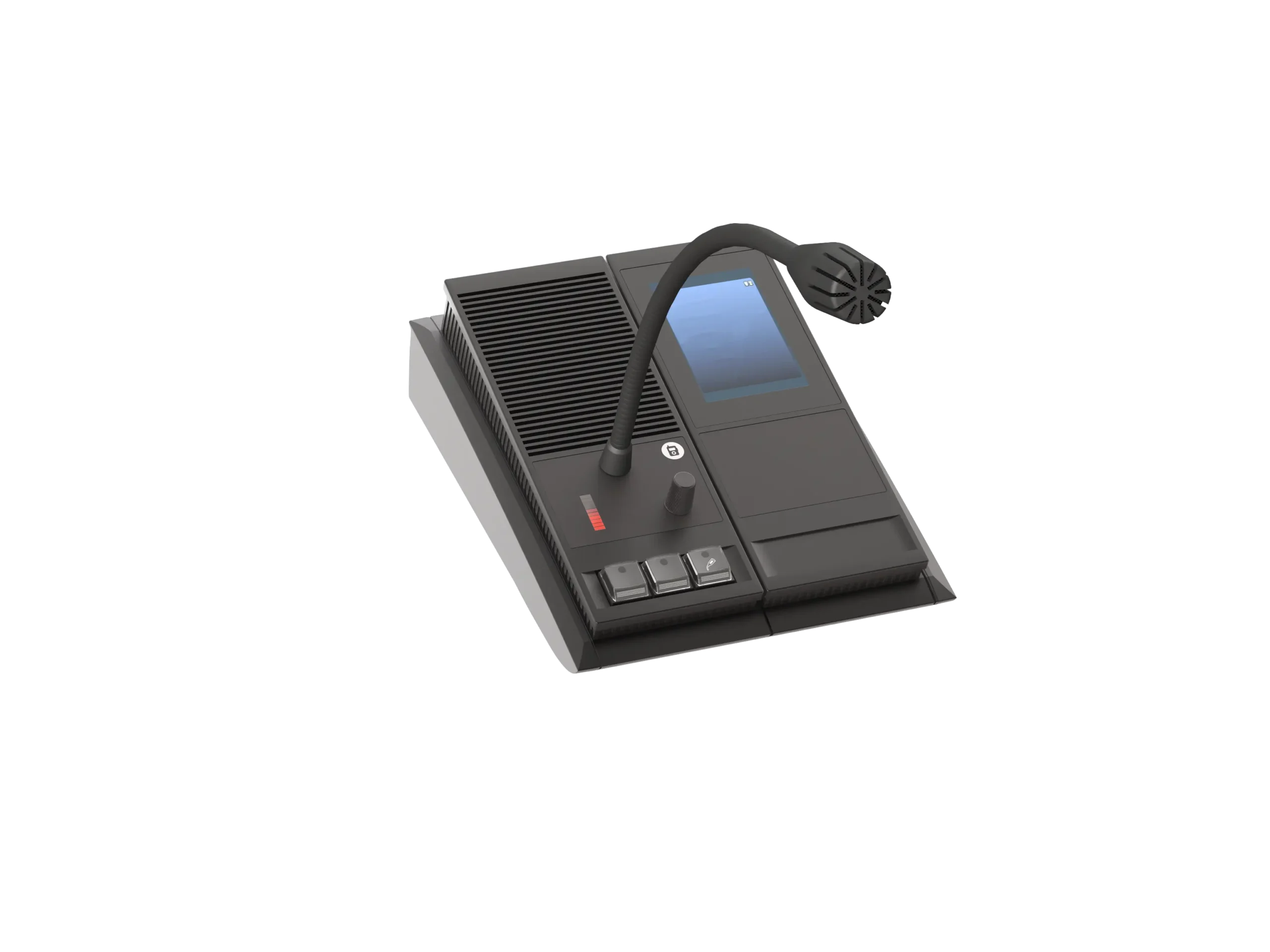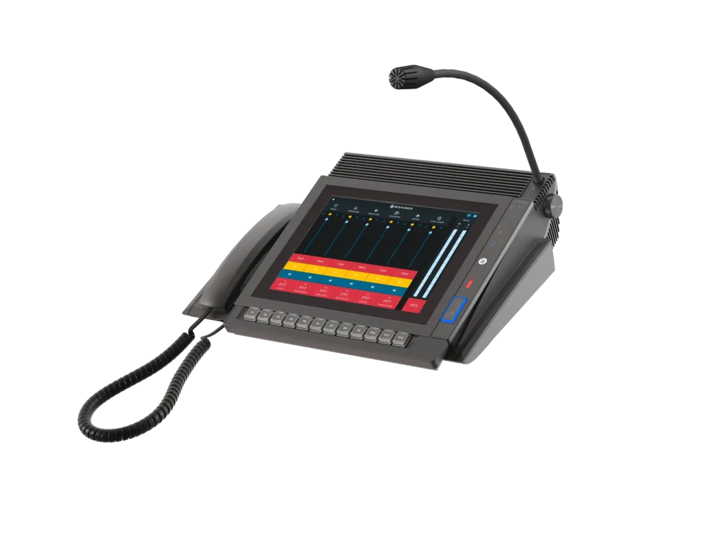 with 3.5" high-brightness, ultra-wide viewing angle LCD touchscreen. Space-efficient design maintains full functionality including gooseneck microphone, speakers, and programmable PTT keys. Silent operation with optional handset capability.