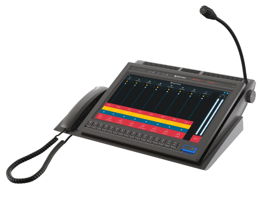 with 15.6" high-brightness, ultra-wide viewing angle LCD touchscreen. Silent operation with no moving parts, integrated gooseneck microphone, powerful speakers, and programmable PTT keys. Optional handset available for enhanced operational flexibility.